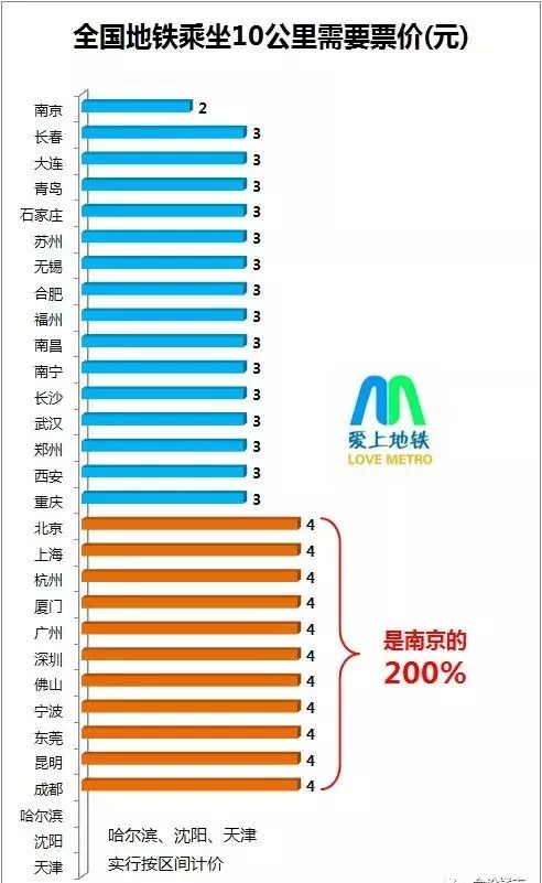 坐10公里,南京最便宜,只需要2元;成都等需要4元,是南京的200%。