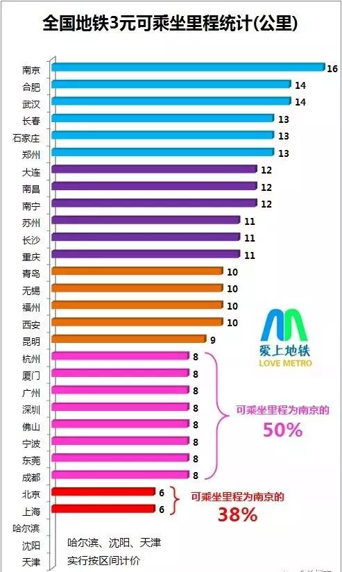 花3元,可乘坐距离最远的仍然是南京为16公里,并列第二的是武汉和合肥为14公里。成都等8个城市可乘坐距离为8公里,仅为南京可乘坐距离的一半,北京、上海为6公里。长春、石家庄、郑州可乘坐距离并列第三,可乘坐13公里。