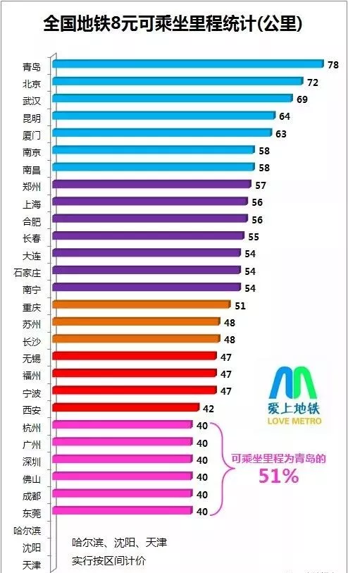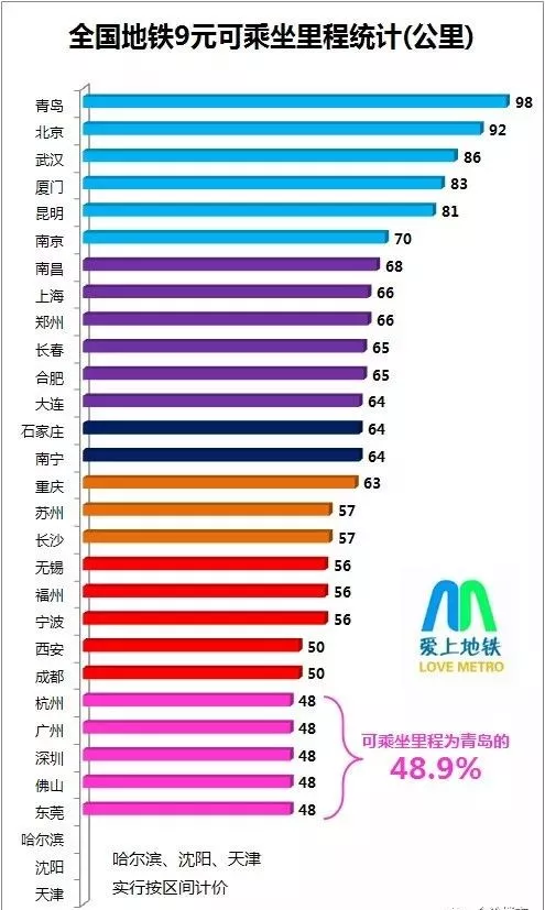 花9元钱,青岛、北京分别位于第一、二。成都终于脱离了并列倒数第一,来到了倒数第二,可乘坐距离为50公里。东莞等5城市处于末位,可乘坐距离为48公里。