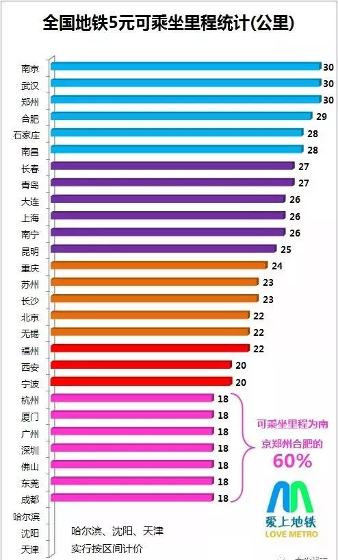 花5元,可乘坐距离,南京、武汉、郑州并列第一,可乘坐30公里。合肥可乘坐29公里,差别不大。成都等7个城市排在末尾,北京已经不在末尾了,可乘坐距离为22公里。