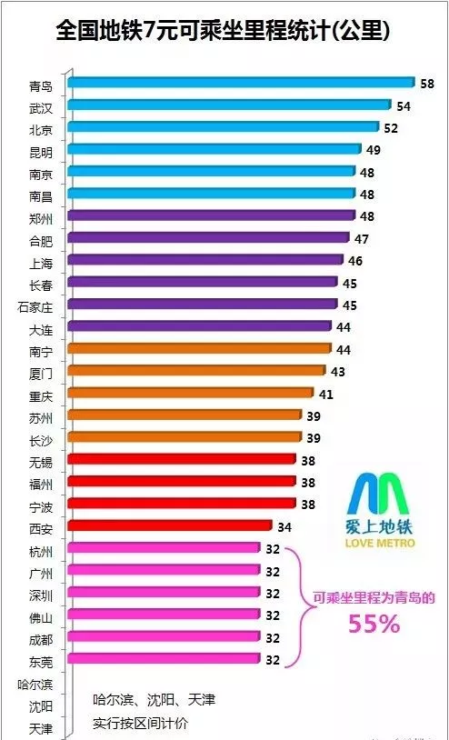 花7元,青岛跑到榜首了,可乘坐58公里。武汉第二,可乘坐54公里。北京来到了第三,为啥3元可乘坐距离北京只有6公里,而花7元,在北京可以乘坐52公里,一下跑到第三了?原因就是票价政策中“递远递减”,说明北京的递远递减幅度很大,换句话说北京对长距离乘客优惠力度很大。