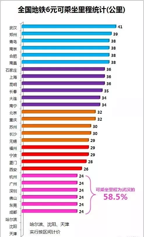 花6元,可乘坐距离,武汉排在第一为41公里,之前一直领先的南京和青岛、合肥、南昌并列第三,可乘坐38公里,郑州可乘坐39公里,排在第二。成都等6个城市排在末尾,可乘坐距离为24公里,为武汉的58.5%。