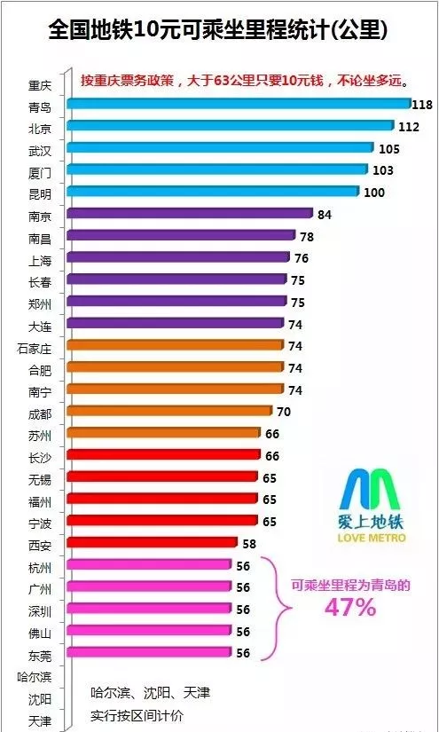 花10元,重庆可以随便坐,只要大于63公里,重庆统统只收10元,只要10元,10元钱随便坐!这也是当前27家按照里程计价的城市中,唯一采用地铁票务封顶政策的城市。另外,10元前乘坐距离超过100公里的有青岛、北京、武汉、厦门、昆明。