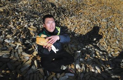 官井村返乡大学生冯慧坐在自家收获的玉米堆上。冯慧家种了八九十亩农田和2500亩沙柳,每年仅粮食就可收十几万斤。