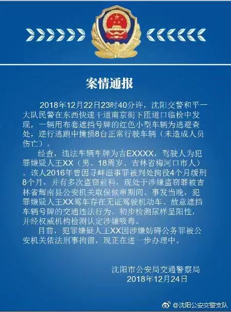 (原标题:沈阳一男子涉嫌吸毒驾驶 逃避警方查处时撞损8辆车)