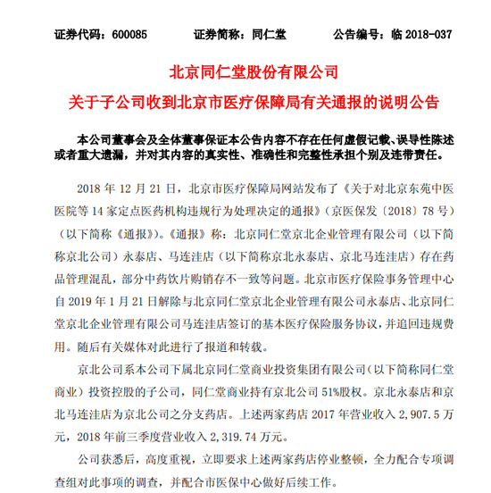 同仁堂(600085)12月24日晚间公告,京北公司永泰店、马连洼店存在药品管理混乱等问题,被北京市医疗保险事务管理中心解除基本医疗保险服务协议,并追回违规费用。同仁堂对此表示,京北公司系公司下属同仁堂商业投资控股的子公司,持股比例51%;前述两家药店2017年营业收入2907.5万元。公司要求上述两家药店停业整顿,本次事项对公司整体生产经营无显著影响,对财务数据影响甚微,不涉及其他药店经营。