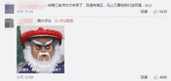 圣诞节在即,无论是街道商店还是朋友圈都掀起了圣诞浪潮,不少人调侃大家都在等待一个红帽子、白胡子的老人,并且配上了徐锦江老师曾经饰演豹子头的剧照,一时间引起了网友的热议,还引来了本尊亲自回复。