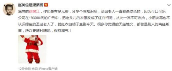 而对于圣诞老人这个红帽子白胡子的设定,赵英俊却现身否认,他表示满屏都是徐锦江老师十分无聊,圣诞老人一直以来都是绿色的!只是曾经因广告被改成了红色,于是一直都成了红帽子白胡子的圣诞老人!不过想来大家纷纷转发徐锦江老师这个圣诞老人也是在表示对徐锦江老师的喜爱吧,毕竟徐锦江老师撞脸过的人物真的是太多了!