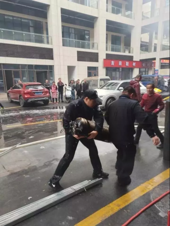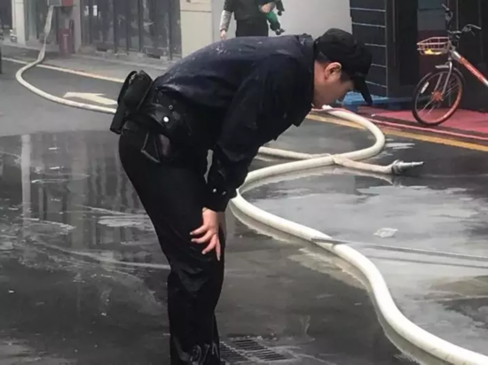 一边是易燃易爆的乙炔瓶口喷出火苗,一边是商业中心来来往往的人群,匆匆赶来的民警在救火结束后,衣服裤子湿透,半俯着身用双手强撑膝盖,累得直不起身。他想尽力关掉漏气的乙炔瓶开关,最后却因吸入毒气导致失去意识倒向地面……