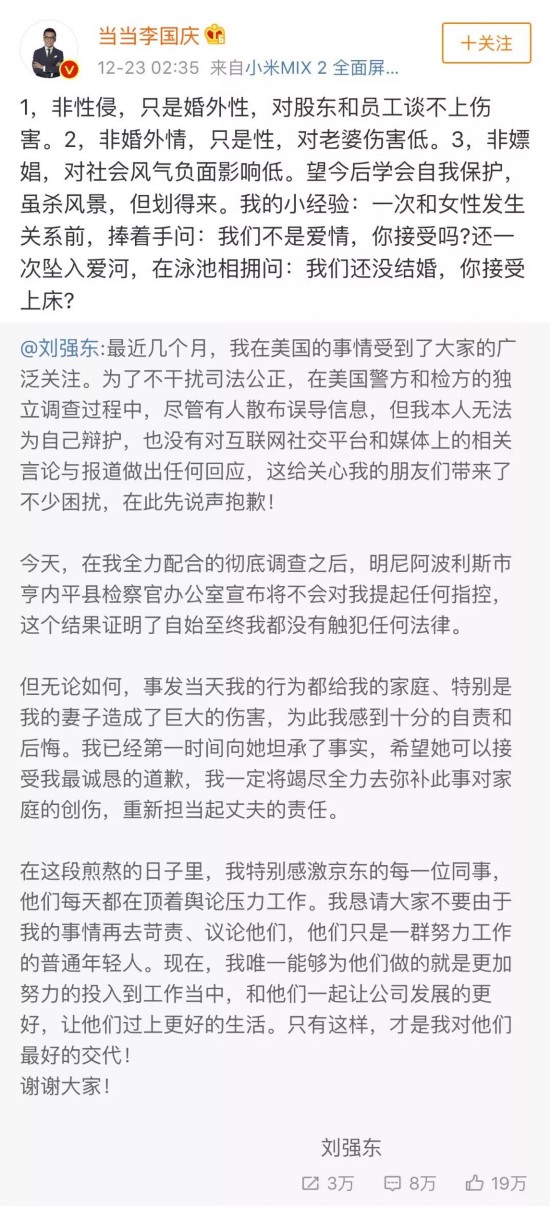 在此之前,李国庆把刘强东在明尼苏达的事定性为“非性侵,非婚外情,只是婚外性”,认为对股东和员工谈不上伤害,对老婆伤害低,“虽杀风景,但划得来。”但他以亲身努力证明了一个公众人物不负责任的言行,会给自己身边的人和机构带来怎样的伤害。
