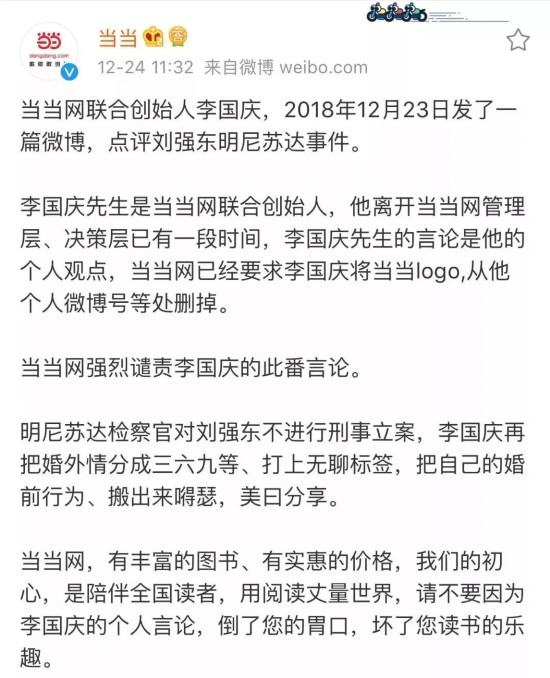 12月24日中午,当当网官方微博发表声明:“当当网联合创始人李国庆,2018年12月23日发了一篇微博,点评刘强东明尼苏达事件。李国庆先生是当当网联合创始人,他离开当当管理层、决策层已有一段时间,李国庆先生的言论是他的个人观点,当当网已经要求李国庆将当当logo,从他个人微博号等处删掉。当当网强烈谴责李国庆的此番言论。”