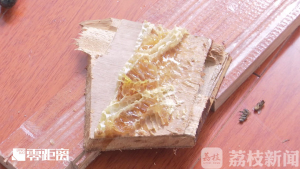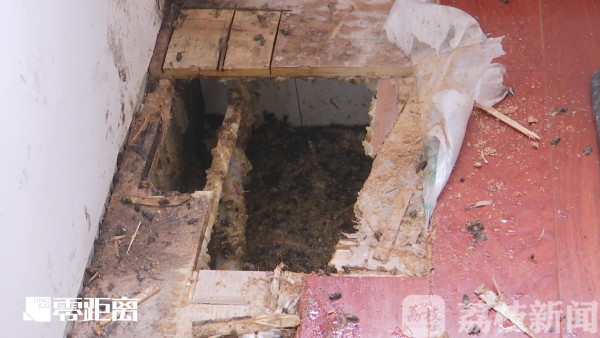 把掉落在地板和窗台上的蜜蜂处理完后,顾先生想想还是不放心。隔天,他把窗台榻榻米的木板凿开一个口子,地板下不但有蜂窝,还有不少蜂蜜。
