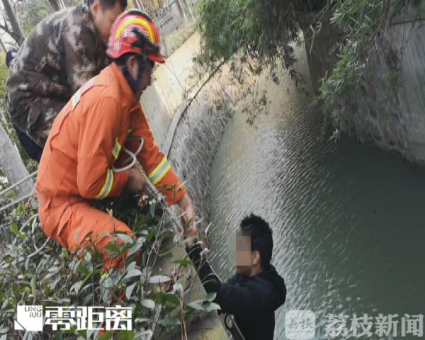 救援人员赶到时,落水少年正站在河道边,水淹至少年腿部位置,水面距岸上约有4、5米的距离,仅凭少年一人无法脱困。