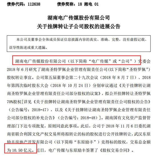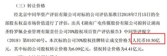 根据公开挂牌结果,电广传媒将本合同项下转让标的以人民币10.50亿元转 让给东原励丰。转让价格包括转让方持有的标的股权的价格,即6.09亿元;以及转让方对标的债权的价格,即4.41亿元。