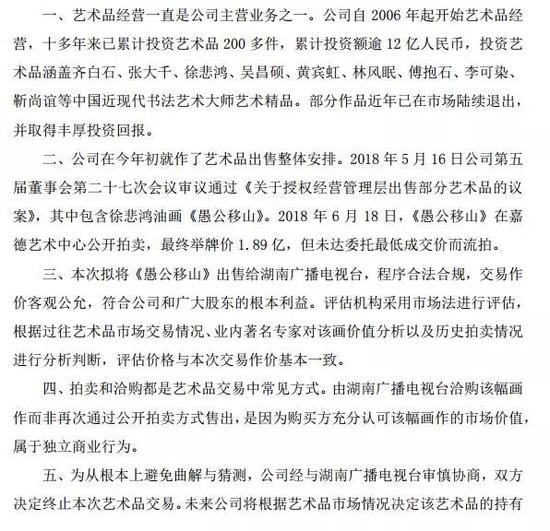 12月15日,电广传媒发布公告称,公司子公司,湖南省有线电视网络(集团)股份有限公司拟将《愚公移山》布面油画以 2.088 亿元的价格出售给湖南广播电视台。
