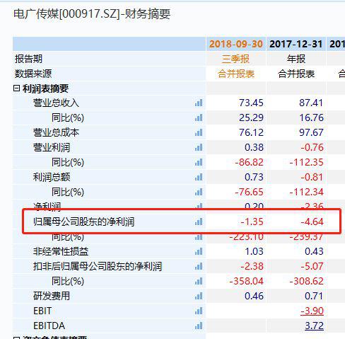 查阅电广传媒财报发现,公司在2017年亏损高达4.64亿元,2018年前三季度净利润亏损达1.3亿元,如果今年全年为亏损状态的话,根据连续两年亏损将被“ST”的规定,电广传媒股票将面临被“ST”的风险。