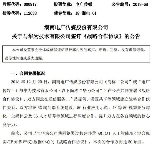电广传媒在公告中强调,这是华为第一家跟全国广电系统签署的共同进军5G领域的战略合作协议。