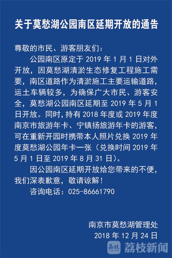今天(12月24日),记者从南京市建邺区新闻发布会上了解到,正在进行环境整治提升工程的莫愁湖公园南区原定于2019年1月1日对外开放,因莫愁湖清淤生态修复工程施工需要,南区道路作为清淤施工主要运输道路,运土车辆较多,为确保市民、游客安全,莫愁湖公园南区延期至2019年5月1日、与北区同时开放。同时,持有2018年度或2019年度南京市旅游年卡、宁镇扬旅游年卡的游客,可在重新开园时携带本人照片兑换2019年度莫愁湖公园年卡一张兑换时间为2019年5月1日至2019年8月31日。