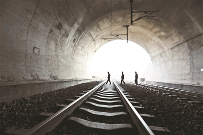 一列运载货物的列车呼啸而过,隧道内强大的气流裹挟着杂尘和轰鸣声,瞬间下降的气温让人感到刺骨的寒冷。