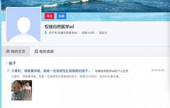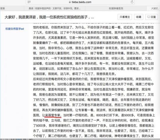 21世纪经济报道记者在权健肿瘤医院的官网上并没有查到这位“神医”的介绍。在百度贴吧名为“权健自然医学ad的个人主页”的一篇文章里,写到这位“神医”,一位叫黄译姿得了系统性红斑狼疮的孩子,在西安儿童医院诊治未果后,经人介绍来到权健肿瘤医院吴葆莹大夫处,两个流程下来,家长就不用为她的病发愁了。