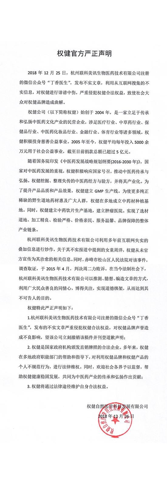12月26日凌晨,权健公司通过其官方微信号发布“严正声明”称,丁香医生微信号发布的文章不实,指责其“利用从互联网搜集的不实信息,对权健进行诽谤中伤,严重侵犯权健合法权益,致使社会大众对权健品牌造成误解。”