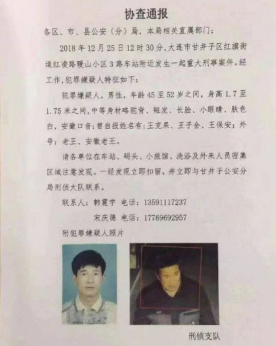 12月25日晚,大连市公安局对外发布协查通报称,当日12时30分,大连市甘井子区红旗街道红凌路附近发生一起重大刑事案件。嫌疑人为男性,年龄在45岁至52岁之间,身高在1.7米至1.75米之间,中等身材略驼背,短发、长脸、小眼睛、肤色白,安徽口音。嫌疑人曾自报姓名有王克果、王子全、王保安等,外号为老王、安徽老王。