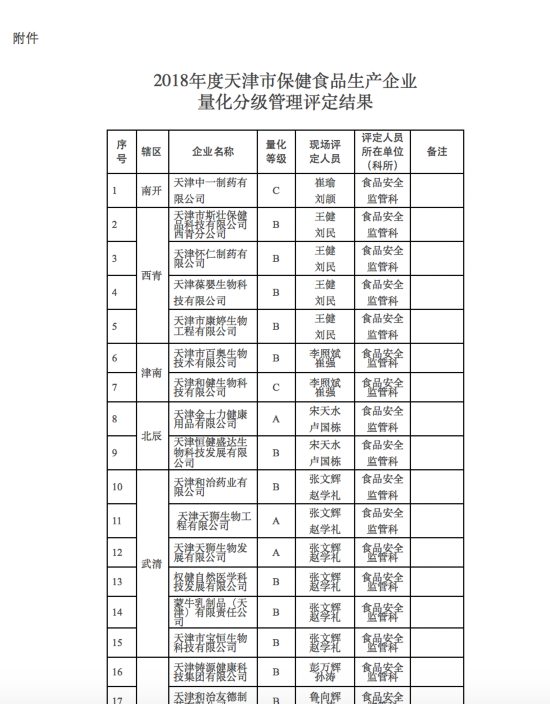据了解,天津市市场监管委制定了2018年天津市保健食品生产企业量化分级分类管理工作实施方案,进一步加强保健食品生产企业量化分级分类管理工作。依据《保健食品良好生产规范》及日常监管情况,通过准确、公平、公正的综合评价,将企业量化等级分为A、B、C、D四个等级:A级为诚信企业,B级为基本诚信企业,C级为警示企业,D级为失信企业。企业量化等级实行按年度评定,实施动态管理。
