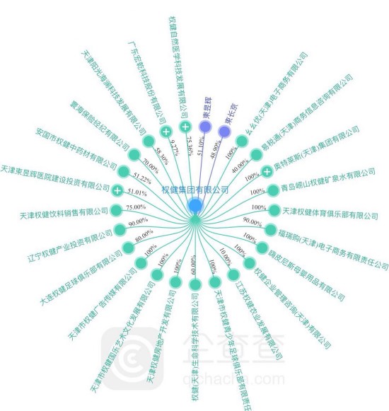 在投资版图上,权健集团共投资了23家公司。其中涉及体育、电子商务、文化传播等类型。此外,企查查信息显示,束昱辉关联34家公司,控股企业达52家。束长京关联22家公司,控股2家企业。权健集团关联风险为48条。