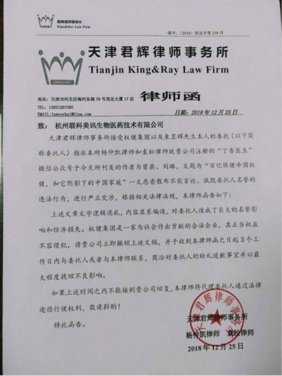 中新网客户端12月26日电(张旭) 近日丁香医生发布的《百亿保健帝国权健,和它阴影下的中国家庭》刷屏朋友圈。26日凌晨,权健发布“严正声明”指责丁香医生“诽谤”并发了律师函给丁香医生。26日下午,丁香医生向中新网表示,这篇文章绝无任何利益相关,并已将所有素材证据做了公证。“我们已经说了,对内容的每一个字负责,不会删稿。”对于收到的律师函,丁香医生表示准备走法律程序。