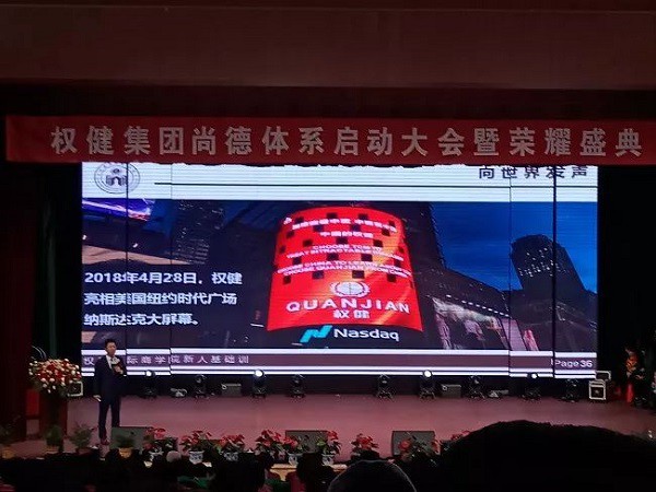 台上演讲人员介绍,权健公司2016年启动海外市场。