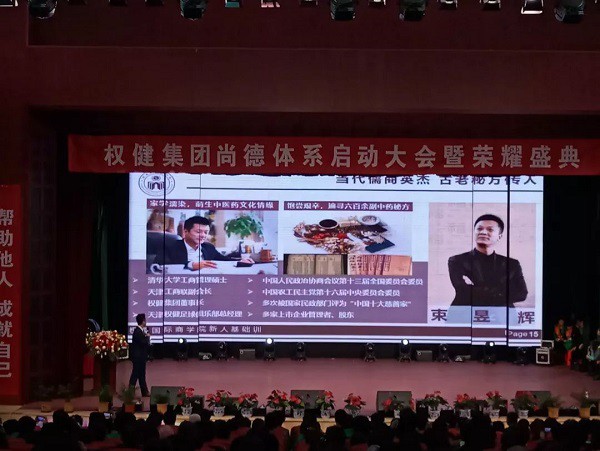 现场PPT显示,权健集团董事长束昱辉为清华大学工商管理硕士。