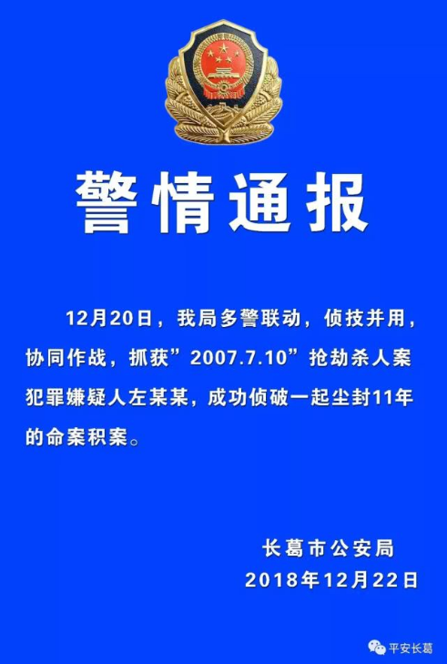 随后十余年里,我局始终未放弃对这起案件的侦破工作,每当技术手段和数据库有更新,技术人员就会把该案的痕迹物证拿出来进行滚动比对,凡是周边地区发生类似案件,办案民警都会第一时间进行专项比对。功夫不负有心人,2018年 8月16日,技术人员在工作中有了重大发现——我市老城镇三里张村左某某(男,35岁)的DNA信息与“2007.7.10”抢劫故意杀人案中提取到的DNA信息相符,左某某有重大作案嫌疑。