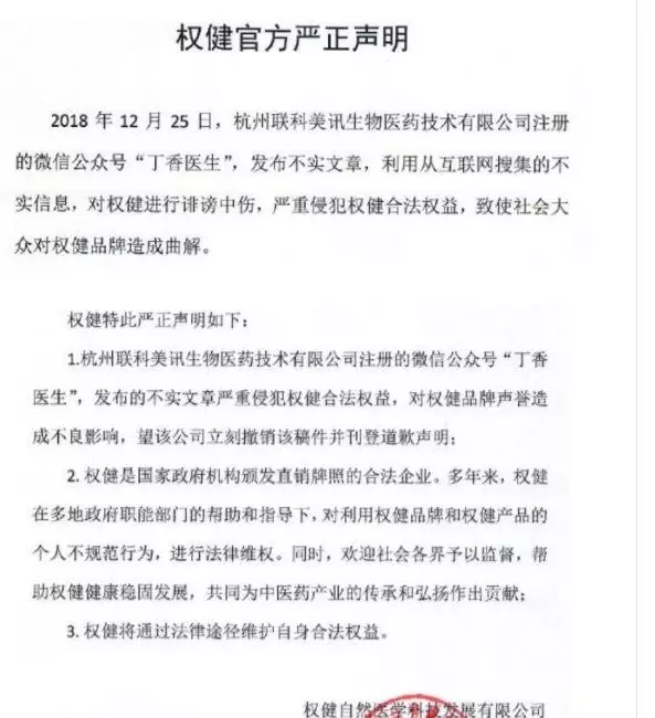 回应称,丁香医生“利用从互联网搜集的不实信息,对权健进行诽谤中伤”。