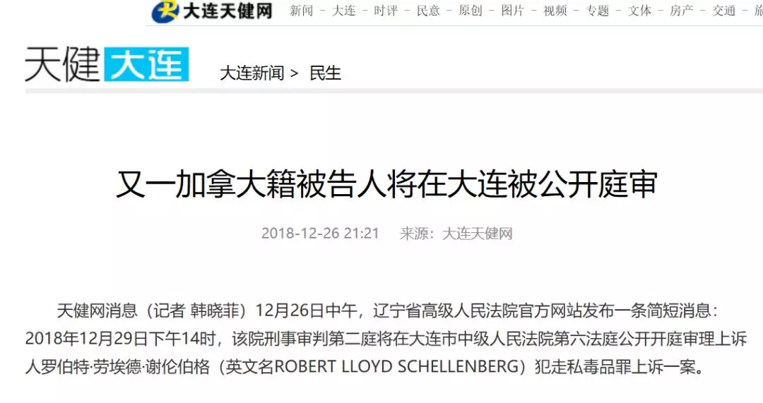 据大连广播电视台旗下的大连天健网报道,辽宁省高级人民法院29日将审理的毒品走私案嫌犯罗伯特·劳埃德·谢伦伯格(英文名ROBERT LLOYD SCHELLENBERG)是加拿大人,且涉案毒品数量巨大。