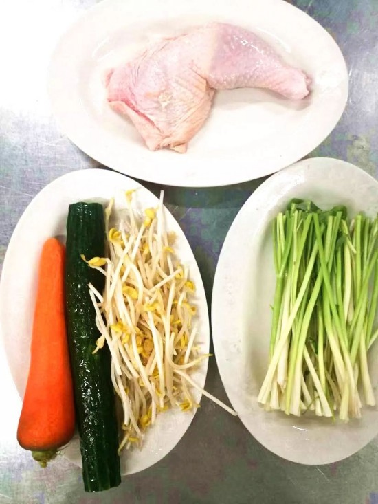 鸡腿、水芹、胡萝卜、黄瓜、黄豆芽。
