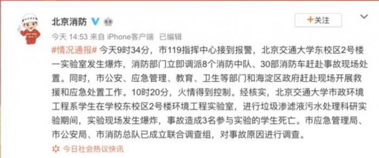 12月26日,据北京消防通报,今天上午,北京交通大学市政环境工程系学生在学校东校区2号楼环境工程实验室,进行垃圾渗滤液污水处理科研实验期间,实验现场发生爆炸,事故造成3名参与实验的学生死亡。10时20分,火情得到控制。