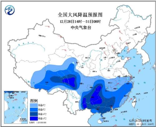 受频繁活动的强冷空气影响,28日至31日,西北地区东南部、青藏高原中东部、淮河以南大部地区将先后降温6~10℃,其中, 湖北西南部、湖南西部和南部、贵州大部、广西大部、广东中西部、云南东部等地的部分地区降温10~12℃,局地超过12℃。我国南方大部地区气温较常年同期偏低5~7℃,其中,贵州大部、湖南西部等地偏低8~10℃。最低温度0℃线将南移至华南北部。此外,长江中下游及以北地区先后有4~6级偏北风;东海西南部和南海部分海域风力将有7~8级,其中,台湾海峡、南海东北部和中东部海域将有9级、阵风10~11级大风。