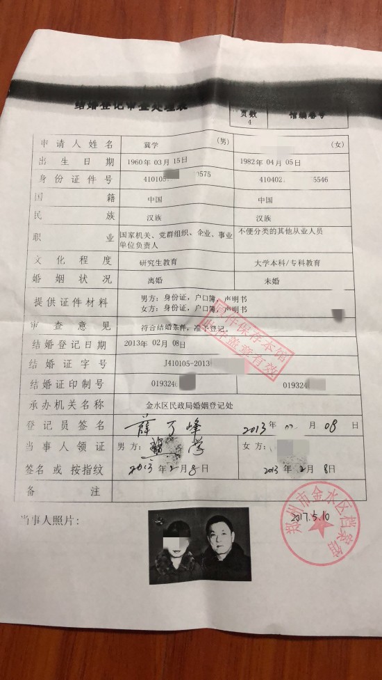 润妍提供的结婚登记审查处理表显示,冀学1960年3月出生,润妍1982年4月出生,两人结婚登记时间为2013年2月8日。