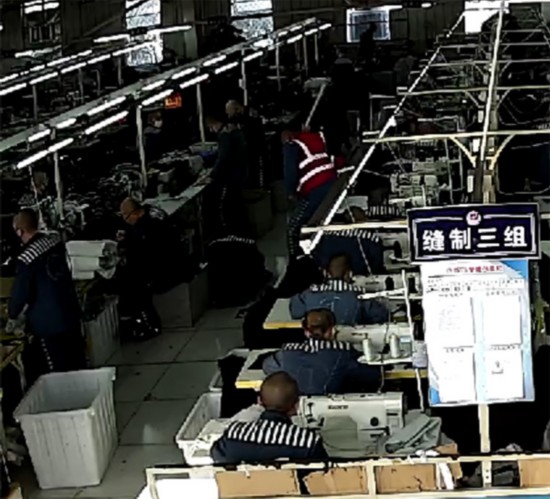 车间南部摄像头录下的监控视频显示,11月4日上午9点17分,王磊和他所在的一监区服刑人员正在车间劳动,王磊的机位位于缝纫三组倒数第六排。10点29分,所有犯人走到车间通道处集合,王磊也在队伍中,状态正常。