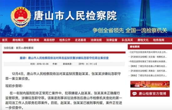 2018年12月4日,唐山市检察院官网通报,两名狱警涉嫌玩忽职守被立案侦查。