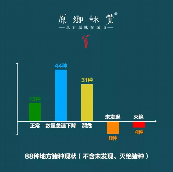 然而,第二次全国畜禽遗传资源调查显示,中国特有的88种地方猪种里,就有85%左右地方猪种的存栏数量急剧下降,其中31个品种处于濒危状态和濒临灭绝。在这次为期五年的调查中,有横泾猪等8个地方猪种未发现,项城猪等4个品种已灭绝。
