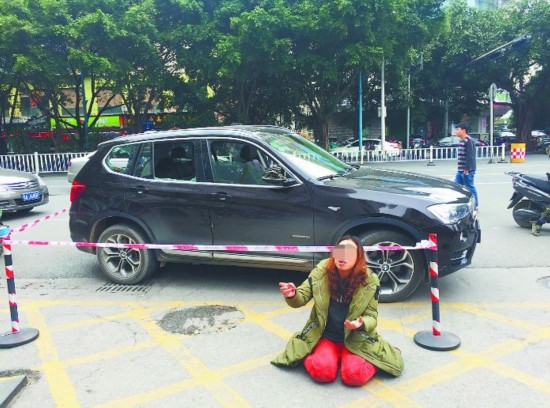 车旁,一名40岁左右的女子跪在地上哭喊,并叫人帮她拨打110。她说,是为了引起大家注意,才把车窗玻璃砸烂。