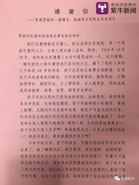 出院后,钱先生用中英文各写了一份感谢信寄给了无锡市政协,感谢以院长芮永军为首的九院所有医务人员的付出。