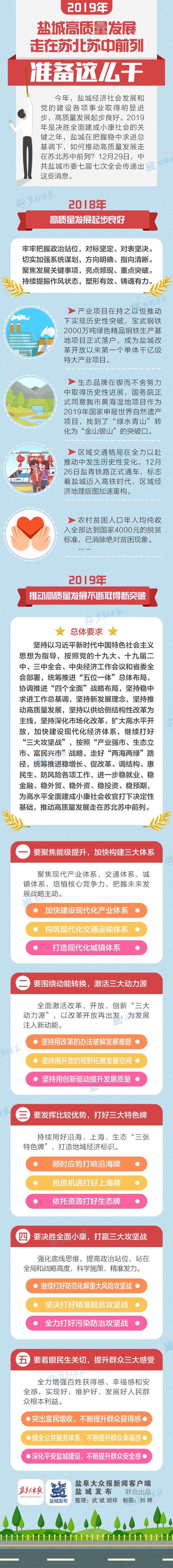 全会指出,做好明年工作,要认真落实中央和省委决策部署,咬定目标不放松,不断丰富拓展“两海两绿”路径,突出抓重点、补短板、强弱项,推动高质量发展不断取得新突破。要聚焦能级提升,加快构建现代产业体系、交通体系、城镇体系“三大体系”。加快建设现代化产业体系,强化重大产业项目引领力,提高特色产业竞争力,提升园区载体承载力。构筑现代化交通运输体系,加快推进高铁网络建设,完善市域交通运输结构,着力打造区域协同的航空枢纽。打造现代化城镇体系,不断提升中心城市首位度,深入实施乡村振兴战略。要围绕动能转换,激活改革、开放、创新“三大动力源”。坚持用改革的办法破解发展难题,用开放的视野拓展发展空间,用创新驱动提升发展质量。深度融入“一带一路”建设,在全市域推进中韩(盐城)产业园建设,发挥淮河生态经济带出海门户作用,统筹推进宝武精品钢、印尼金光、国电投、中海油等重大项目建设,打造全国特大项目集中区资源综合利用循环经济样板。要发挥比较优势,打好沿海、上海、生态“三张特色牌”。顺时应势打响沿海牌,放大港口资源优势,优化沿海产业布局,发挥河海联动开发示范区作用。抢抓机遇打好上海牌,推动产业接轨,注重市场接轨,强化科创接轨。依托资源打好生态牌,全力以赴推进申遗,重点突破生态旅游,积极培育生态文化。要决胜全面小康,打赢防范化解重大风险、精准脱贫、污染防治“三大攻坚战”。继续打好防范化解重大风险攻坚战。妥善处理地方债务风险,重点防控金融风险,高度关注各类社会风险。坚决打好精准脱贫攻坚战,强化兜底保障,因地制宜发展特色产业,总结推广基层成功经验。全力打好污染防治攻坚战,深入实施“263”专项行动,坚决抓好环保督察“回头看”问题整改,全力打好蓝天、碧水、净土保卫战,加大化工园区整治力度。要着眼民生关切,提升群众获得感、幸福感和安全感“三大感受”。突出富民增收,抓住创业就业富民“牛鼻子”,稳住就业基本盘,不断提升群众获得感。健全公共服务体系,全面落实省基层基本公共服务功能配置标准,加强教育资源供给,加强医疗卫生资源供给,加快建立健全多层次社会化的养老服务体系,丰富优质公共文化供给,不断提升群众幸福感。深化平安盐城建设,坚持“三到位一处理”化解社会矛盾,加强重点领域、重点行业、重点群体风险防控,深入开展扫黑除恶,加强社会治理体系建设,做好应急管理机构改革,加强安全生产源头管控,全面推进依法治市,不断提升群众安全感。