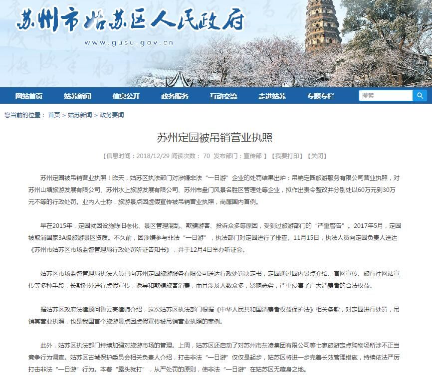 苏州定园被吊销营业执照!据苏州市姑苏区政府官网,12月28日,姑苏区执法部门对涉嫌非法“一日游”企业的处罚结果出炉:吊销定园旅游服务有限公司营业执照,对苏州山塘旅游发展有限公司、苏州水上旅游发展有限公司、苏州市盘门风景名胜区管理处等企业,拟作出责令整改并分别处以60万元到30万元不等的行政处罚。业内人士称,旅游景点因虚假宣传被吊销营业执照,尚属国内首例。