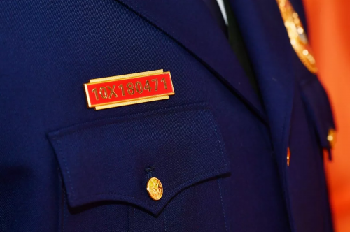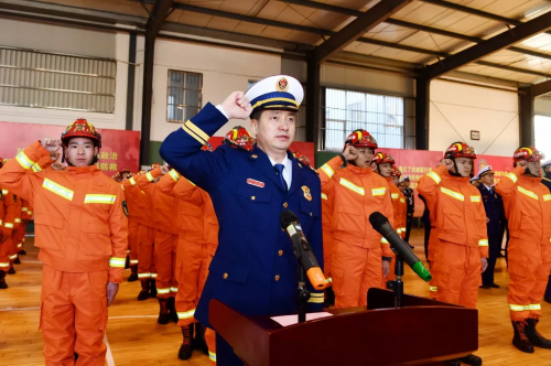 下午2:30,仪式正式开始,全场高唱国歌,仪仗队员护卫着中国消防救援队队旗,步伐坚定,走向主席台前。仪式现场宣读授予消防救援衔命令,全体消防救援人员向“中国消防救援队”队旗敬礼并集体宣誓。
