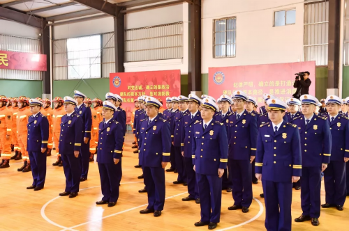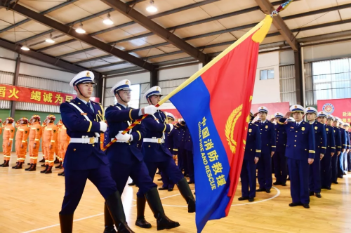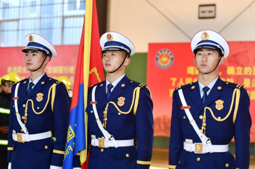 仪式现场气氛庄重热烈,120余名消防指战员精神抖擞、整齐列队。