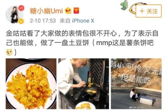 在生活中糖小幽也寄予了Doinb选手最贴心的照顾。众所周知Doinb身上的标签除了“新疆中单”之外,还有“土豆丝骨灰级爱好者”。doinb酷爱土豆,喜欢与土豆相关的一切美食,甚至在直播中提到想要建一个特别大的“土豆种植基地”,而每次Doinb放假,糖小幽也总会做各种土豆食物。