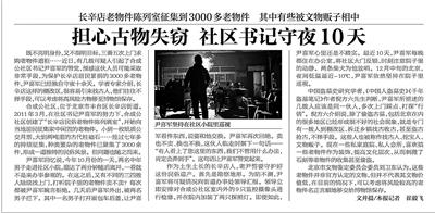 12月12日本报A5版以《担心古物失窃 社区书记守夜10天》为题报道了此事。