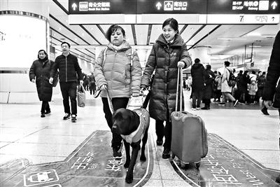 从北京南站站台到地下停车场的路上,黑萌萌要经过电梯,绕过障碍物。第一次看到火车站川流不息的人群,黑萌萌刚开始有些无所适从,在南站润秋服务组张润秋的帮助和陈燕不断发出的“good good”的鼓励下,它很快适应了新环境。张润秋说,以前珍妮和陈燕来北京南站乘坐高铁,服务组的工作人员都会接送,和她们成了好朋友,现在黑萌萌接班,相信它也一定能当好陈燕的眼睛。